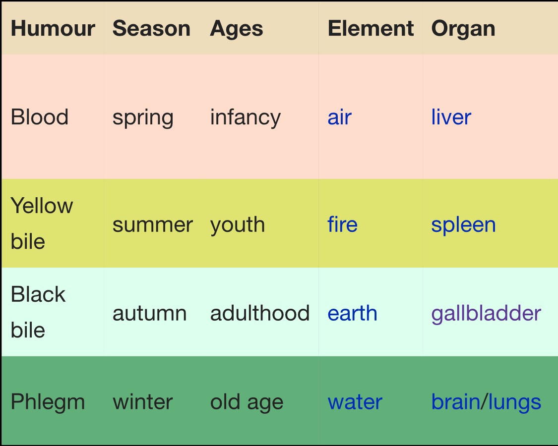We understand that each of these humors would wax and wane in the body, depending on diet and activity. When a patient was suffering from a surplus or imbalance of one of these four fluids, then said patient’s personality and or physical health could be negatively affected. This theory was closely related to the theory of the four elements: earth, fire, water and air; earth predominantly present in the black bile, fire in the yellow bile, water in the phlegm, and all four elements present in the blood.