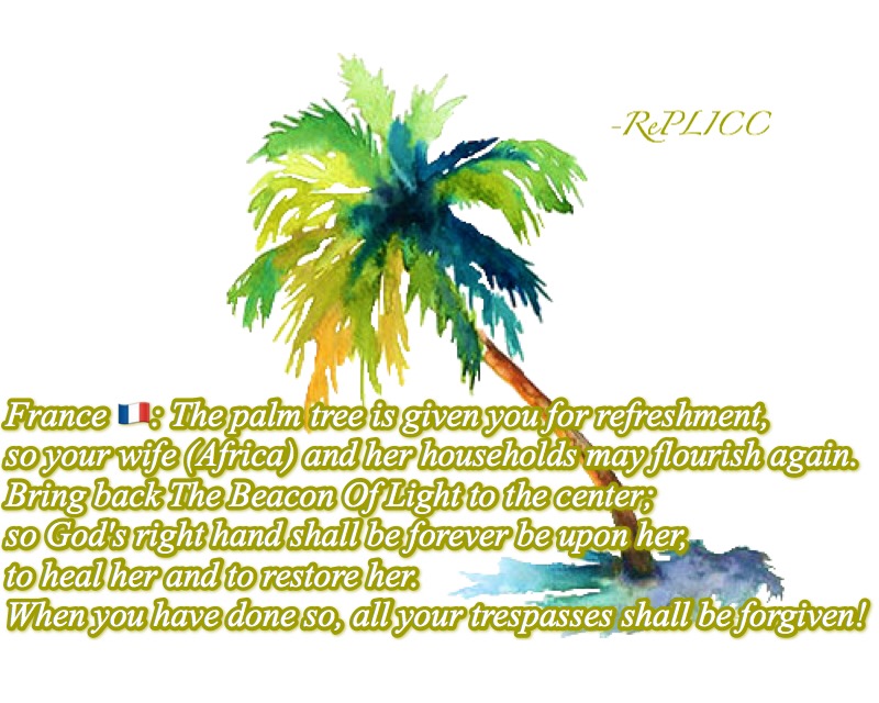 France 🇫🇷: The palm tree is given you for refreshment, so your wife (Africa) and her households may flourish again. Bring back The Beacon Of Light to the center; so God’s right hand shall be forever be upon her, to heal her and to restore her. When you have done so, all your trespasses shall be forgiven!